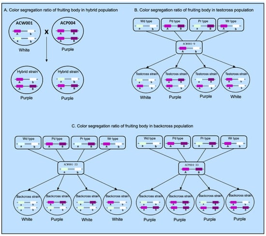 Strain ACW001 is not recessive homozygous at the color control locus A and lacks a dominant gene at the color control locus B and, thus, is not able to synthesize the key enzyme B, which results in the generation of white inbred progenies. In contrast, strain ACP004 is dominant homozygous at the color control loci A and B and produces purple inbred and hybrid progenies with strain ACW001 (Figure 5A). Alignment with the BioEdit tool (https://bioedit.software.informer.com/, accessed on 15 January 2022) revealed that the color control locus B is located on the genome Contig19, while the AcveA locus is located on the genome Contig9. Since the two genes are not on the same contig and there is no genome at the chromosome level, it remains unclear whether the two loci are on the same chromosome and, therefore, it is impossible to confirm the possible linkage between the loci. According to the Law of Independent Assortment, if there is no linkage between locus A and locus B, the ratio of gametes produced by the four combinations of ACW001-33×ACP004-33 should be 1:1:1:1 and the theoretical ratio of white to purple FBs should be 1:1 (Figure 5B). After back-crossing with recessive monokaryotic parental strains, the theoretical ratio of white to purple FBs was 3:1 (Figure 5C). The inbred progenies of the hybrid ACW001-33×ACP004-33 were not completely produced by random pairing due to restrictions of the mating-type genes; thus, the color segregation ratio was not considered in this study.