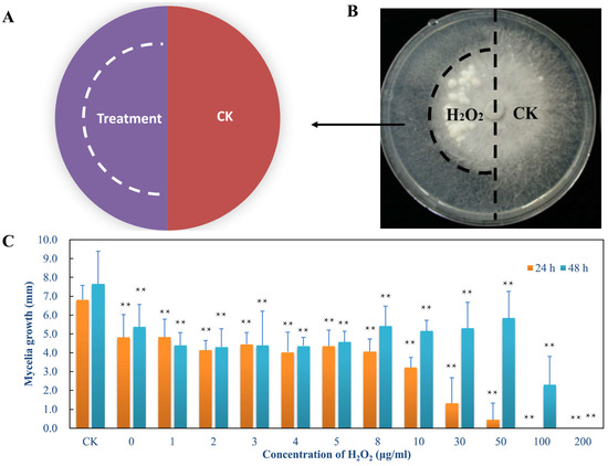 Hydrogen-peroxide-induced mycelial culture. (A) Schematic illustration of L. edodes mycelia. (B) Mycelial morphology after 20 days of treatment. (C) Mycelial growth rate after 24 and 48 h of treatment. Mean ± SD, n = 8. ** p < 0.01 vs. CK.