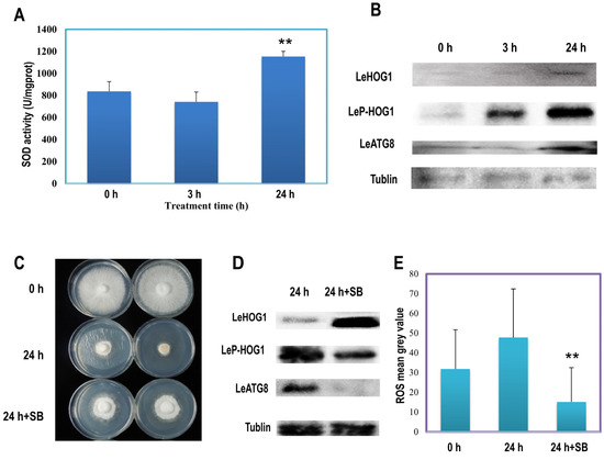 H2O2 induces oxidative stress by exerting cytotoxic effects and increasing intracellular superoxide (O2·¯) levels [31]. In the present study, treatment with H2O2 for 24 h significantly increased the antioxidant activity of superoxide dismutase (SOD) activity (Figure 3A). Moreover, DCFH-DA dyeing results showed that the treatment increased the ROS content of the mycelia (Figure S9). The high-osmolarity glycol (HOG) pathway may be associated with oxidative stress. Hog1 is activated by dual phosphorylation on a tripeptide motif (Thr-X-Tyr) via promoting high levels of ROS [32]. Therefore, Western blotting was used to verify the expression levels of LeATG8 and LeHOG1 and the expression level of phospho-LeHOG1 in H2O2-induced ageing mycelia. The expression of LeATG8 and LeHOG1 showed no change in the mycelia after 3 h of H2O2 treatment compared with the control (Figure 3B) but was upregulated after 24 h of treatment, indicating that autophagy was induced by H2O2. Meanwhile, the phosphorylation level of LeHOG1 increased as early as 3 h and continued to increase until 24 h (Figure 3B). This immediate and long-lasting phosphorylation of LeHOG1 suggested that LeHOG1 played a crucial part in response to oxidative stress and the activation of LeATG8-dependent autophagy. Furthermore, we used the HOG1 inhibitor SB203580 to inactivate LeHOG1 selectively. SB203580 (10 μM)-pretreated cellophane and untreated cellophane were used for mycelial culture, which was then treated with 100 μM H2O2 and incubated for 24 h. SB203580 slightly relieved the growth inhibition caused by exogenous H2O2 treatment (Figure 3C). At the protein level, SB203580 reduced LeHOG1 phosphorylation and LeATG8 expression (Figure 3D). However, LeHOG1 expression was increased. According to statistical analysis, on adding the SB203580 inhibitor, the intracellular ROS was significantly reduced compared with the H2O2 treatment group (Figure 3E and Figure S9). Inactivation of LeHOG1 might inhibit the function of LeATG8, demonstrating that the LeATG8-dependent autophagy in L. edodes was strongly correlated with LeHOG1 MAPK activity or even phosphorylation.