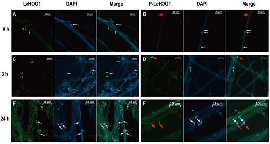 Subcellular localisation of LeHOG1 and phospho-LeHOG1 in mycelia treated with 100 μM H2O2. (A,C,E) Immunofluorescence of LeHOG1-labelled (green) and DAPI-stained (blue) mycelia after 0, 3, and 24 h of treatment. (B,D,F) Immunofluorescence of phospho-LeHOG1-labelled (green) and DAPI-stained (blue) mycelia after 0, 3, and 24 h of treatment. Yellow arrows indicate LeHOG1-labelled mycelia. Red arrows indicate phospho-LeHOG-labelled mycelia. White arrows indicate nuclei.