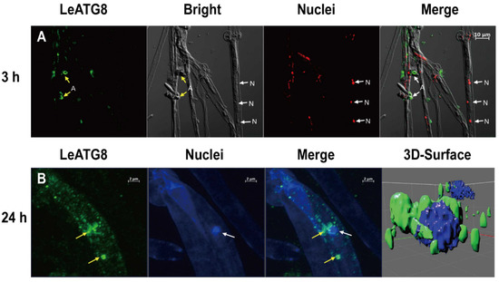 Subcellular localisation of LeATG8 in the mycelia treated with 100 μM H2O2. (A) Immunofluorescence of LeATG8-labelled (green) and DAPI-stained (blue) mycelia after 3 h treatment. (B) Immunofluorescence of LeATG8-labelled (green) and DAPI-stained (blue) mycelia after 24 h treatment. Yellow arrows indicate LeATG8-labelled mycelia. White arrows indicate nuclei. A, autophagosome; N, nuclei.