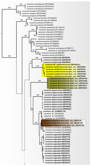 Best-scoring ML tree based on the analysis of ITS sequence data. Bootstrap support values are given above the branches. The new sequences generated in this study are indicated in bold and new Lecanora species is highlighted.