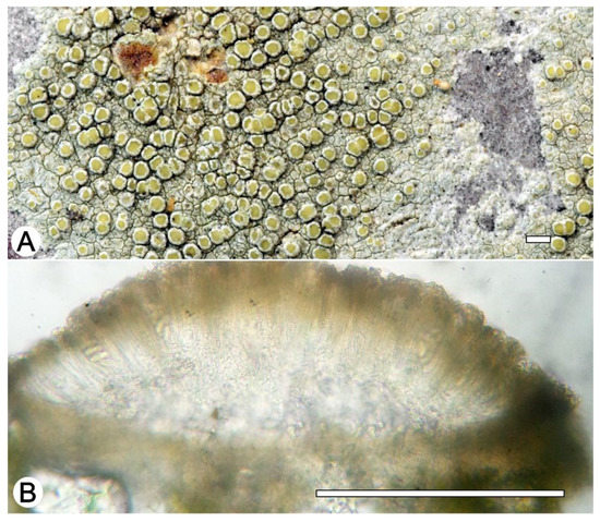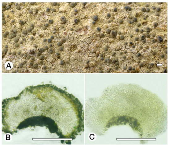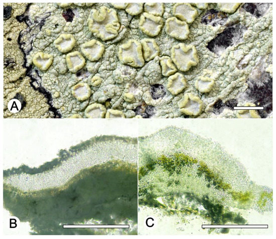 Lecanora fluorosaxicola sp. nov. (A) Thallus with ascomata (holotype, ISE-54033); (B,C) Apothecial section after KOH treatment (holotype ISE-54033). Scale bars: (A), 1 mm; (B,C), 100 μm.