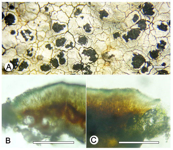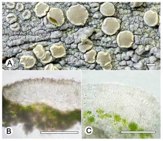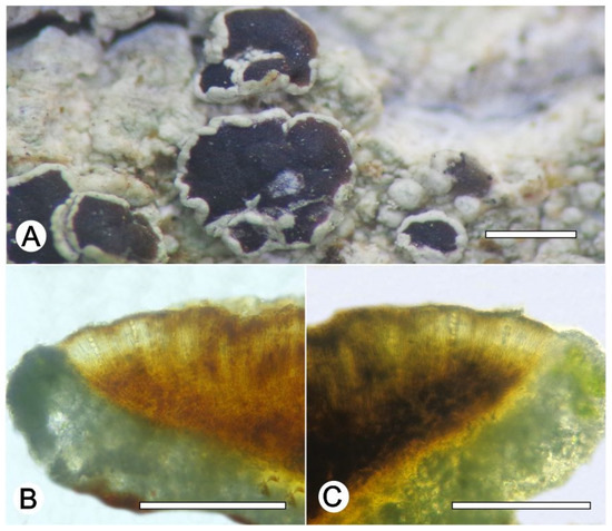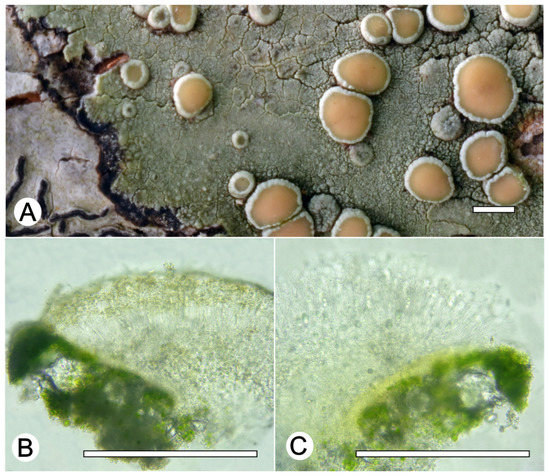 Lecanora glaucomodes. (A) Thallus with ascomata (ISE-46533); (B) Apothecial section in water (ISE-46533); (C) Apothecial section after KOH treatment (ISE-46533). Scale bars: (A), 1 mm; (B,C), 100 μm.