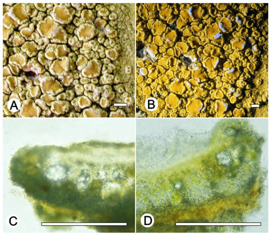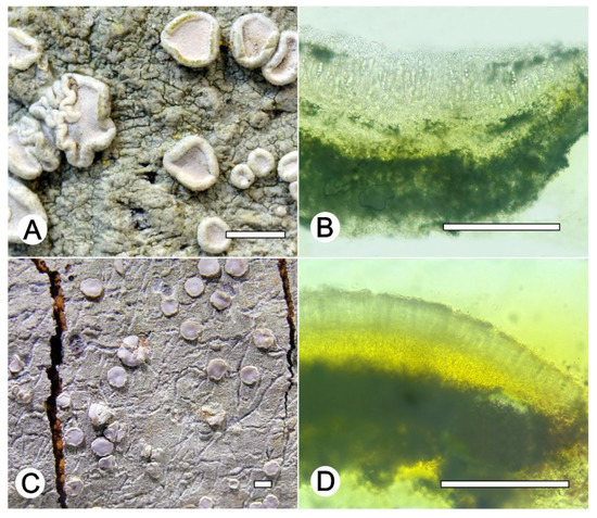 Lecanora neomerrilli nom. nov. (A) Thallus with ascomata (ISE-38146); (B) Apothecial section after KOH treatment (holotype ISE-38146); (C) Thallus with ascomata (ISE-52228); (D) Apothecial section after KOH treatment (holotype ISE-52228). Scale bars: (A–C), 1 mm; (B–D), 100 μm.