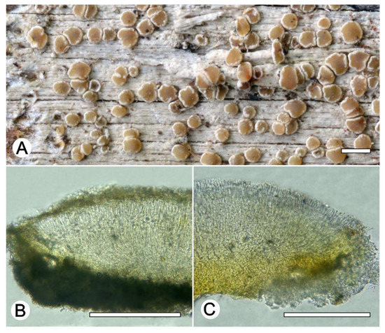 Lecanora neohelva sp. nov. (A) Thallus with ascomata (holotype ISE-52342); (B) Apothecial section in water (holotype ISE-52342); (C) Apothecial section after KOH treatment (holotype ISE-52342). Scale bars: (A), 1 mm; (B,C), 100 μm.