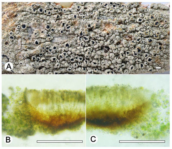 Lecanora saepiphila sp. nov. (A) Thallus with ascomata (holotype ISE-42612b); (B) Apothecial section in water (holotype ISE-42612b); (C) Apothecial section after KOH treatment (holotype ISE-42612b). Scale bars: (A), 1 mm; (B,C), 100 μm.
