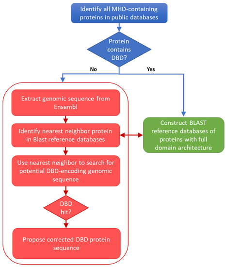 For each MHD-only sequence with a BLASTP hit to a nearest-neighbor reference protein, two complementary approaches were implemented to search for the missing DBD sequence. First, a local TBLASTN search was performed in the genomic sequence of the potential error sequence, using the protein DBD sequence segment of the nearest neighbor as a query. TBLASTN alignments with an E-value < 0.0001 were taken into account. Second, a global pairwise alignment was performed between the genomic sequence of the MHD-only sequence and the full-length protein sequence of the nearest neighbor, using the ProSplign software developed by the NCBI (https://www.ncbi.nlm.nih.gov/sutils/static/prosplign/prosplign.html, accessed on 12 August 2022). ProSplign is a tool for protein-to-genomic sequence alignment, and it is an integral component of the NCBI Eukaryotic Genome Annotation Pipeline. Genes are first localized on the genomic sequence in a compartmentalization step that starts with computing protein-to-genomic blast hits. These give initial insight into the structure of compartments. Hits are separated into two same-strand sets and then compartments are identified within each strand. To do so, the optimization problem is formally defined in terms of genomic sequence coverage and then solved with a dynamic programming algorithm. ProSplign has been shown to produce accurate spliced alignments and is able to compute alignments of distantly related proteins with low similarity.