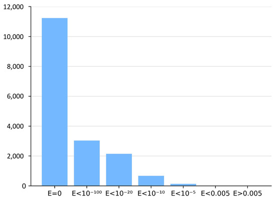 For each MHD-only sequence, BLASTP searches were performed in the two BLAST reference databases containing Zn2C6 and C2H2 sequences in combination with an MHD. The nearest-neighbor sequences with the required domain combination (i.e., DBD and MHD) were selected if a BLASTP hit was identified with an E-value < 0.005. Figure 2 shows the E-value distribution of BLASTP hits obtained for all neighbor sequence searches.