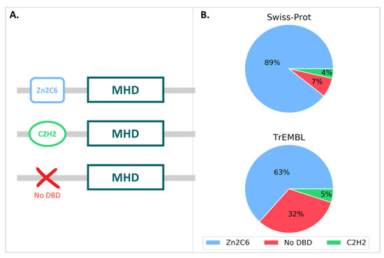 For the 170 proteins from the Swiss-Prot section, nearly 90% contained the Zn2C6-MHD domain pair, although this combination was found in a smaller proportion of the TrEmbl proteins with only 63.4%. Conversely, the proportion of MHD-only proteins lacking an annotated DBD was much higher in TrEmbl (31.6%) than in Swiss-Prot (7.1%).
