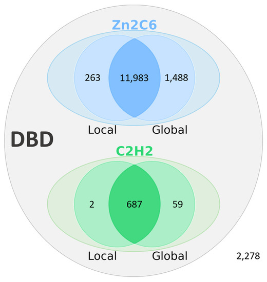 Results of the error identification step in 16,760 MHD-only TF sequences from the TrEMBL database. Number of DBD (Zn2C6 or C2H2) identified by local and global alignment methods. A total of 14,482 MHD-only TF sequences could be attributed to gene prediction errors, while no DBD could be identified for the remaining 2278 sequences.