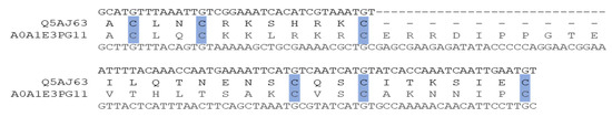 Predicted DBD for Candida albicans sequence Q5AJ63_CANAL, aligned with neighbor sequence A0A1E3PG11_9ASCO (hmmsearch E-value = 6.5 × 10−10). Conserved cysteines characterizing the Zn2C6 DBD are highlighted in blue.