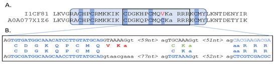 (A) Protein alignment of query I1CF81 with the neighbor A0A077X1Z6, showing the partial hit identified by the protocol, where the predicted sequence presents five of the six conserved cysteines that characterize the Zn2C6 DBD (hmmsearch E-value = 1.5 × 10−11). Exon/intron boundaries are indicated by gaps in the sequences. (B) Genome-level comparison of query I1CF81 with the neighbor A0A077X1Z6, showing correctly predicted amino acids (blue), protocol mispredicted amino acids (red), and alternative manual prediction (green).