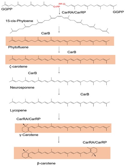 Four desaturations on the phytoene backbone are required for β-carotene production, resulting in the crimson intermediate lycopene and the -cyclization of both ends of the molecule (Figure 2). In photosynthetic organisms, phytoene and ζ-carotene desaturases, two distinct enzymes, are responsible for each desaturation [168]. In fungi, however, the four desaturations are carried out by a single enzyme. In photosynthetic species, however, different genes encode the phytoene synthase and cyclase enzymes. Thus, only two fungal genes are required to produce β-carotene from GGPP, one encoding a bifunctional phytoene synthase/lycopene cyclase and the other encoding a desaturase. The desaturase gene is known as gene carB, and the phytoene synthase/lycopene cyclase gene, known as carRA or carRP, is connected to gene carB in the genome and is divergently transcribed from a shared upstream region, forming a single regulatory unit [169,170].