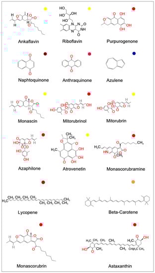 Chemical structure of some available fungal food pigments (Source: National Center for Biotechnology Information. PubChem Compound Database; (https://pubchem.ncbi.nlm.nih.gov); accessed on 1 April 2023).
