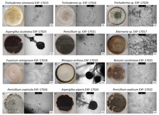 The genus Rhizopus is probably the best-known genus in the class of Mucoromycetes fungi (belonging to the newly formalised phylum of Mucoromycota), containing species that occur naturally in soils and live on decaying plant material or as airborne spores. Species of Rhizopus genus exhibit a complex metabolism and produce a variety of enzymes that either allow them to utilise a wide range of substrates or are used in industrial applications [33]. Species of the genus Rhizopus are very fast-growing, producing white mycelium and black sporangia, visible to the naked eye, and with a cottony texture, such as the R. arrhizus EXF-17019 (No. 8) isolate (Figure 1). In microscopic observations, the hyphae of R. arrhizus are nonseptate, forming rhizoids at the base of the sporangiophores and columella in the sporangium.