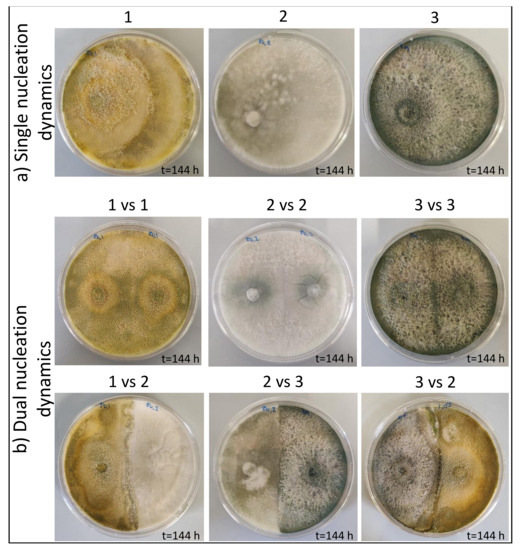 (a) Single nucleation dynamic and (b) Dual nucleation dynamic assay of Trichoderma strains. Fungal cultures were performed on a PDA medium as described in the Materials and Methods section. Pictures were taken up to 144 h post-cultivation. Fungal strains are as reported in Table 2, i.e., Trichoderma simmonsii EXF-17015 (No. 1), Trichoderma sp. EXF-17016 (No. 2), and Trichoderma sp. EXF-17020 (No. 3).
