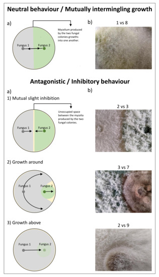 In the case of mutual slight inhibition, observed between Trichoderma strains, it is possible to observe that the growing mycelium produced by both colonies approach each other until they are almost in contact, leaving a well-marked, narrow, unoccupied space between them (e.g., 2 vs. 3 in Figure 3). It is, however, possible to identify two more sub-types of this antagonistic/inhibitor behaviour according to Porter et al. [46], namely, growth around and growth above.