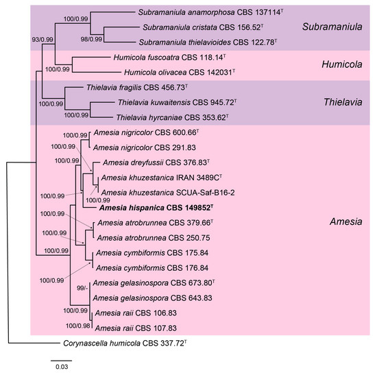 The phylogenetic analysis was carried out based on the combination of the four loci of our isolate and those of the type and reference strains of all species of Amesia, plus selected members of the Chaetomiaceae (Table 1). Each locus was aligned separately using MAFFT v. 7 [23] and manually optimized using MEGA v. 10.2.4 [24]. Loci were concatenated after checking for no conflicts [25,26]. The maximum-likelihood (ML) and Bayesian inference (BI) methods were used in a phylogenetic analysis as described by Harms et al. [10]. Bootstrap support (bs) ≥ 70% and posterior probability values (pp) ≥ 0.95 were considered significant [27]. The sequences generated in this study were deposited in GenBank (Table 1), and the alignments used in the phylogenetic analysis are included in Supplementary Material.