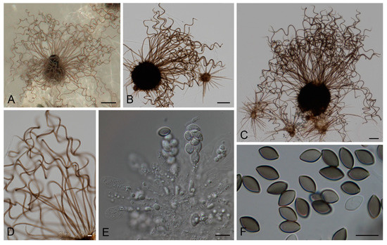 Amesia hispanica sp. nov. (CBS 149852). (A–C). Ascomata. (D). Terminal ascomatal hairs, (E). Asci. (F). Ascospores. Scale bars: (A) = 100 μm; (B,C) = 50 μm; (D–F) = 10 μm.