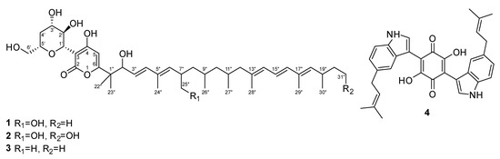 Compound 4 was obtained as a dark purple powder and its molecular formula was established as calculated for C32H30N2O4 (nineteen degrees of unsaturation), according to the quasimolecular ion peak cluster at m/z 507.22760 [M + H]+ in the HRESI-MS spectrum. Compound 4 was identified, based on 1H and 13C NMR data, as cochliodinol.