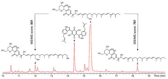 HPLC-UV/Vis chromatogram (210 nm) of the crude extract from the rice culture of A. hispanica sp. nov. with peaks of isolated compounds indicated by bold numbers referring to the depicted molecules (1–4). Over the arrows, the MS/MS similarity scores between MS/MS spectra from compounds 2 and 3 and the MS/MS spectrum of 1 are shown. Complete HPLC-UV/Vis chromatogram (210 nm) from 0 to 25 min is shown in Figure S20.