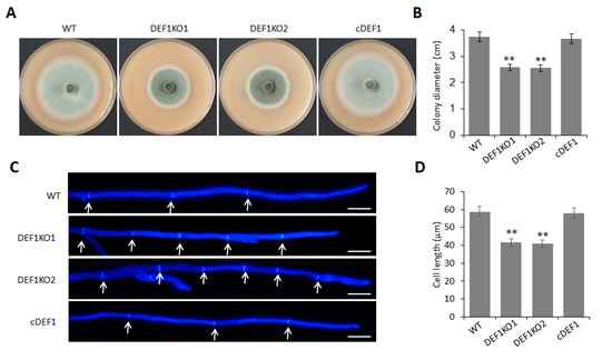 To investigate the role of Def1 in mycelial growth, we observed the colony morphology and size of the Δdef1, wild type, and complementary strain cultured on OTA plate at 5 dpi at 28 °C. The colony diameter of Δdef1 was around 2.6 cm, which was significantly smaller than that of the wild type and complementary strains (~3.8 cm) (Figure 2A,B). Furthermore, Calcofluor White (CFW) staining showed that the average lengths of hypha apical cells of Δdef1 were significantly shorter than those of the wild type and complementary strains, which accounted for the decreased colony diameter of Δdef1 (Figure 2C,D). These results indicated that Def1 plays an important role in fungal vegetative growth.
