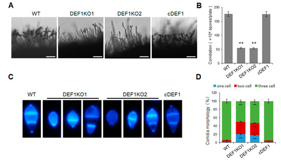 In order to determine whether Def1 is involved in the conidium formation of M. oryzae, we observed and quantified the conidia production of the Δdef1, wild type and complementary strains. The results showed that the Δdef1 produced 70% fewer conidia compared to the wild type and complementary strains. Consistent with this, the conidia on the conidiophores in Δdef1 were much sparser than those in the wild type and complementary strains (Figure 3A,B). In the wild type and complementary strains, more than 90% of the conidia had two septa and three cells, and almost no single-celled conidia were observed. However, in the Δdef1, only about 50% of the conidia were three-celled, while nearly 50% were double-celled (one septum) or single-celled (no septum) (Figure 3C,D). This result suggested the conidia in Δdef1 were obviously abnormal in morphology compared with those in the wild type and complementary strains. Above results suggested that Def1 is crucial for conidium formation.