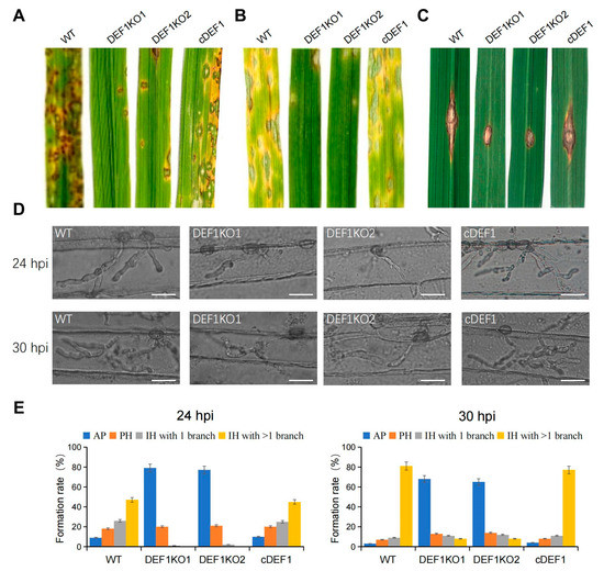 To further reveal why the Δdef1 lost full virulence, we observed the fungal infection process in barley epidermis cells. We found that the Δdef1 was obviously blocked in both appressorial penetration and invasive growth during infection. At 24 hpi, more than 90% of the appressoria of the wild type and complementary strains have penetrated into the plant cells, with 75% of them having developed secondary infection hyphae (IH) with branches. In contrast, nearly 80% of appressoria of Δdef1 could not penetrate into the host cells, and the infection hyphae were mostly without branches. At 30 hpi, more than 80% of the appressoria of the wild type and complementary strains had developed branched secondary infection hyphae, while it was no more than 10% in the Δdef1 mutants. Moreover, over 60% of the appressoria of Δdef1 still blocked in penetration (Figure 4D,E). These results indicated that Def1 plays crucial roles in both appressorial penetration and invasive growth of M. oryzae during infection.