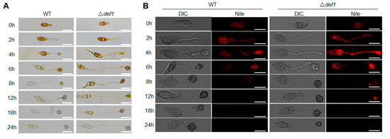 Def1 affects utilization of glycogen and lipid during appressorium development. Stain the wild type (WT) and knock out mutant Δdef1 with I2/KI solution (A) and Nile Red (B) and observed at different time points during appressorium development. Glycogen was stained and exhibited yellowish-brown color. Lipid was stained and fluoresce red. Bar = 20 μm.