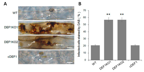 DAB staining assay. (A) Barley epidermis cells were inoculated with different strains and then stained with DAB at 30 hpi, and observed after decolorization. Arrows indicate appressoria (AP) and infection hyphae (IH). Bar = 20 μm. (B) Percentages of infected cells which stained by DAB. Significant differences are labelled with asterisks (**, p < 0.01). WT, wild type; DEF1KO1 and DEF1KO2, two independent def1 knock out mutants; cDEF1, complementary strains.