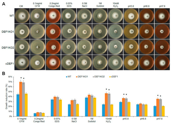 Def1 is involved in various stresses responses. (A) The colony morphology of different strains grown on CM plates containing different stress agents at 28 °C for 5 days. (B) Growth reduction rates calculated by colony diameter of different strains growing under different stress for 5 days. Significant differences are labelled with asterisks (*, p < 0.05). WT, wild type; DEF1KO1 and DEF1KO2, two independent def1 knock out mutants; cDEF1, complementary strains.
