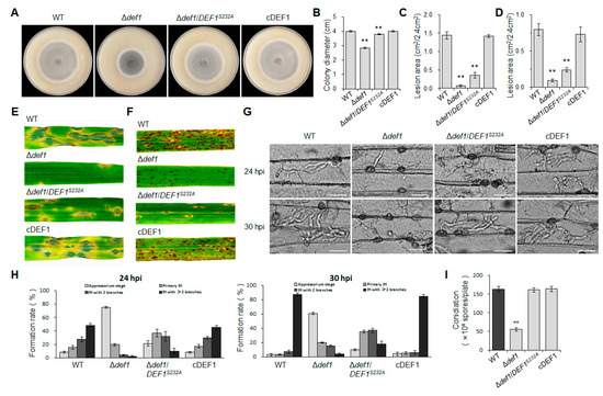 To further determine the role of Def1 in M. oryzae, we disrupted this gene in the wild-type strain P131 through a gene displacement strategy using a split-marker approach [37]. The transformants were screened by PCR-based methods, and two independent Def1 deletion mutants, DEF1KO1 and DEF1KO2, which displayed similar phenotypes, were obtained for subsequent analyses (Figure S1). The complementary strains were generated by introducing the native promoter-driven Def1 into the deletion mutant DEF1KO1. As expected, all of the complementary strains showed restored phenotypes, suggesting the phenotypic defects of the deletion mutants resulted from the loss of Def1. Then, we selected one complementary strain, cDEF1, for further analysis.