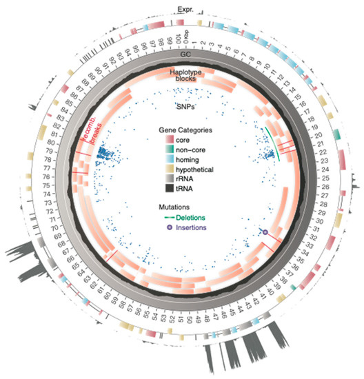 To pinpoint the sites most likely to be involved in recombination, we used the GARD algorithm. It identified eight recombination breakpoints in the reference genome (Figure 1). The first and second breakpoint clusters (at 19,496, 20,252, 20,917 bp and 34,542, 36,204 bp, respectively) are found in loci associated with the complex mutation of mushroom 10018; these two breakpoint clusters are unlikely to be accurate because the GARD algorithm does not take indels into account. The last breakpoint cluster (76,740, 79,657, 81,531 bp) coincides with the 79–82 kbp region characterizing the reference and diverged haplotype groups (Figure 3) and it may be an explanation for the region’s distinctively high nucleotide diversity. Lastly, the breakpoint at 62,833 bp is found in the intron of the SSU rRNA.