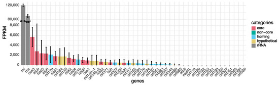 The LSU and SSU rRNA genes are the most expressed genes, with FPKM values of 120,284 and 90,088, respectively. Following the rRNA genes, the five most highly expressed genes are COX4, ATP9, NAD3, ATP6, and ORF179 (FPKM = 5659, 2764, 2360, 2326, and 2114, respectively) (Figure 2). Core genes have higher FPKM values compared with noncore, homing endonuclease, and hypothetical genes (Dunn’s post hoc test p-value < 0.05), whereas noncore, homing endonuclease, and hypothetical genes are not significantly different from each other. Certain homing endonuclease genes also have high FPKM values (e.g., ORF179 encodes a homing endonuclease), and these homing endonucleases are located in introns of rRNA genes. We hypothesize that the seemingly high expression levels of these homing endonuclease genes are caused by their presence within the introns of rRNA genes; they are likely expressed as pre-rRNA but remain within introns after the introns are cleaved. We note that our transcriptomic protocols were originally intended to generate sequences from nuclear mRNA and so we used a poly-A pulldown assay. Our expression estimates may reflect the protocol’s bias to nuclear mRNA, as mitochondrial RNAs generally lack poly-A tails. Nonetheless, if all mitochondrial transcripts lack poly-A tails, then the pulldown assay should inflict little bias among the expression levels of mitochondrial genes.