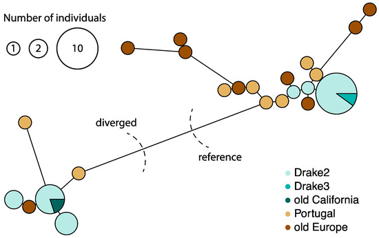 Haplotype network of Amanita phalloides mitochondria. Two distinct groups are labeled as either “reference” or “diverged”.