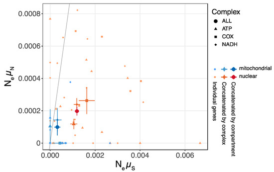 As mitochondrial and nuclear genomes may contain different proportions of coding, noncoding, and other (e.g., nongenic) regions, simply comparing the nucleotide diversity of entire genomes may be misleading. To avoid potentially confounding variables, we estimated the πn and πs of the respiratory complexes. Using the same rationale as we used for entire genomes, we can estimate the product of Ne and the synonymous mutation rate (Neµs), and the product of Ne and the nonsynonymous mutation rate (Neµn). Separating the estimates for synonymous and nonsynonymous mutation rates allows us to distinguish neutral mutations from mutations under the influence of selection. The mitochondrial Neµs is half of the nuclear Neµs, whereas the mitochondrial Neµn is twice the nuclear Neµn (Figure S2). After removing the outlier gene NAD6, the estimated mitochondrial Neµs is a quarter of the nuclear Neµs, and the mitochondrial Neµn is half of the nuclear Neµn (Figure 4). Whether we remove the outlier or not, the mitochondrial πn/πs is approximately twice or more of the nuclear πn/πs, and a higher mitochondrial than nuclear πn/πs is supported by 98 out of 100 bootstrap analyses. We hypothesize that the lower Neµs of mitochondrial genes is caused by a smaller effective population size, which, in turn, is caused by a lower recombination rate and stronger background selection. The smaller effective population size due to background selection also results in inefficacious selection on nonsynonymous sites.