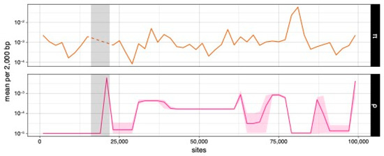 Nucleotide diversity (π) and population recombination parameter (ρ) estimates every 2000 bp. Light-gray areas mark the region with complexed indels. Light-pink ribbon (ρ) marks the 95% credible interval of the estimates. Dashed line indicates estimates not estimated.