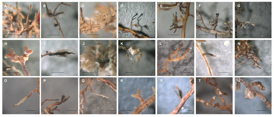 Morphotypes observed on field plants. Birch roots with (A) Lactarius mammosus, (B) Meliniomyces bicolor (Pinirhiza bicolorata-type with emanating hyphae), and (C) Inocybe lacera; oak roots with (D) Meliniomyces bicolor (Cenococcum geophilum-type), (E) non-identified O_F_MT2, (F) Meliniomyces bicolor (Pinirhiza bicolorata-type w/o emanating hyphae), and (G) Cortinarius bivelus; pine roots with (H) Tomentella ellisii, (I) Meliniomyces bicolor (C. geophilum-type), (J) Rhizopogon mohelnensis, and (K) Tricholoma argyraceum. With inoculated pot plants, birch roots formed mycorrhizae with (L) non-identified B_inoc_MT1, (M) non-identified B_inoc_MT2, and (N) non-identified B_inoc_MT3; oaks roots with (O) non-identified O_inoc_MT1, (P) non-identified O_inoc_MT2, (Q) Pisolithus arhizus; and pine roots with (R) Inocybe lacera, (S) Meliniomyces sp., (T) Meliniomyces bicolor, and (U) Rhizopogon mohelnensis. Bar always represents 1.0 mm.