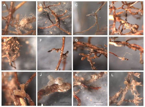 Morphotypes observed on non-inoculated pot plants. Birch roots with (A) non-identified B_non_inoc_MT1, (B) non-identified B_non_inoc_MT2, (C) non-identified B_non_inoc_MT3, (D) non-identified B_non_inoc_MT4, (E) non-identified B_non_inoc_MT5; oak roots with (F) non-identified O_non_inoc_MT1, (G) non-identified O_non_inoc_MT2, (H) Meliniomyces; pine roots with (I) Inocybe lacera, (J) non-identified P_non_inoc_MT2, (K) non-identified P_non_inoc_MT3, (L) non-identified P_non_inoc_MT4. Bar always represents 1.0 mm.