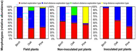 Pot birches had mycorrhiza grouped into contact and short-distance exploration types. The ratio of relative abundance of exploration types in pots differed from that observed from field trees. While for non-inoculated birches, the amount of short-distance exploration type significantly increased to 45.5%, for the inoculated variants, the contact exploration type constituted 95%.
