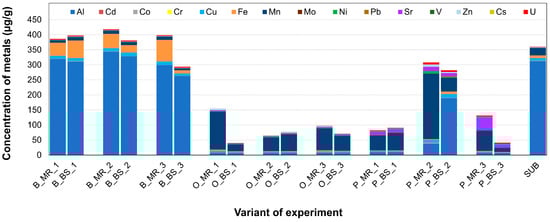 Sum content of toxic metals’ bioavailable fractions determined in test field soil. B—birch, O—oak, P—pine; MR—mycorrhizosphere of field plant, BS—bulk soil, SUB—control pot substrate.