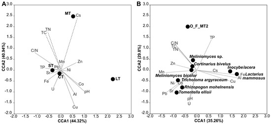 Canonical correspondence analysis biplot representing the correlation (A) between soil parameters and exploration types of mycorrhizae and (B) between soil parameters and mycorrhizal taxa described for field plants. CT—contact exploration type, ST—short-distance exploration type, MT—medium-distance exploration type, LT—long-distance exploration type.
