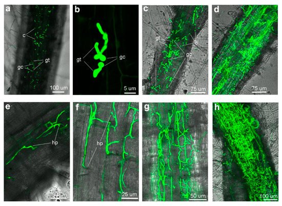 - Marcel, S.; Sawers, R.; Oakeley, E.; Angliker, H.; Paszkowski, U. Tissue-adapted invasion strategies of the rice blast fungus Magnaporthe oryzae. Plant Cell 2010, 22, 3177–3187. [Google Scholar] [CrossRef]