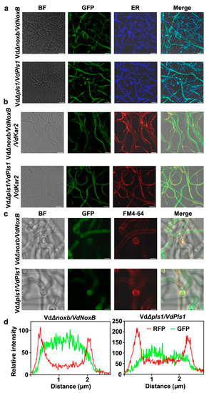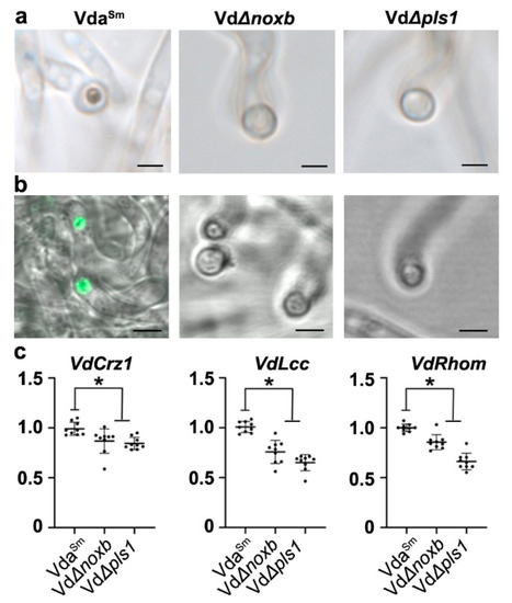 3.4. VdNoxB and VdPls1 Were Highly Expressed in Hyphopodia and Localized at the Position of Penetration Peg Emergence in VdaSm