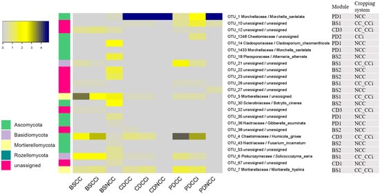 3.3. Cropping-Sensitive OTU Identification, Co-Occurrence Networks, and Key Taxa