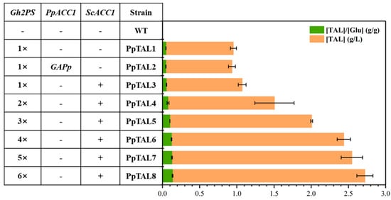 | PpTAL7 | PpTAL6 Int1::pTEF1-Gh2PS-t0547 | 5 copies of Gh2PS and 1 copy of ScACC1* | This study |