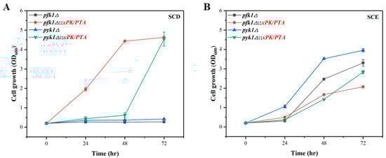 3.4. Verification of PK Pathway in P. pastoris via Growth Complementation