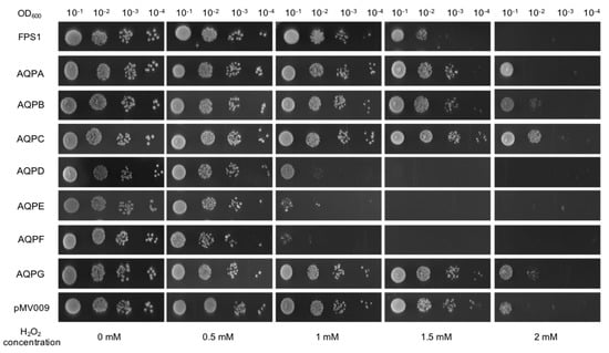 S. cerevisiae transformants expressing A. niger AQPs were constructed to investigate their abilities in hydrogen peroxide import by indirect and direct experiments. In the indirect experiments, colony growth was monitored in the presence of 0–2 mM hydrogen peroxide (Figure 2). The S. cerevisiae strain used as a negative control contained the ‘empty’ pMV009 vector expressing a GFP control sequence, whereas the strain overexpressing the yeast aquaporin FPS1 worked as a positive control [13,19]. Due to their ability to facilitate the import of toxic amounts of hydrogen peroxide, the growth of the strains individually carrying the A. niger aqpD, aqpE, or aqpF genes was severely inhibited, starting at 1 mM hydrogen peroxide with a cell concentration below OD600 of 0.1 (Figure 2). However, the strains expressing aqpA, aqpB, aqpC, or aqpG showed a growth pattern similar to that displayed by the negative control. The positive control FPS1 showed inhibition at 1.5 mM hydrogen peroxide. At the highest concentration, 2 mM, all strains, including the negative control, were affected, although some of them still appeared to show some growth when high cell concentrations were spotted.