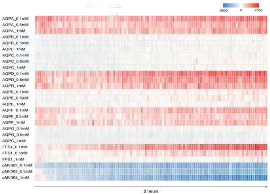 The transport of hydrogen peroxide was studied using a fluorescence-based assay adapted from Bienert et al. [18]. Yeast cells were pre-cultured on the solid selective YNB medium for 2 days. Three-mL liquid cultures were inoculated with a single colony and supplemented with 2′,7′-dichlorodihydrofluorescein diacetate (DCFHDA; Sigma-Aldrich, St. Louis, MO, USA) with a final concentration of 1 µM. Cells were grown at 30 °C and 250 rpm in darkness overnight to an OD600 of 1.6. The cells were washed five times in 20 mM HEPES buffer, pH 7.0, and finally resuspended in HEPES buffer at an OD600 of 1.4. The yeast cell suspensions were aliquoted into 96-well plates with 200 µL per well. The suspensions were followed over time at room temperature using a microplate reader with fluorescent mode (SynergyTM Mx Monochromator-Based Multi-Mode Microplate Reader; BioTek, Broadview, IL, USA) at excitation/emission of 492/527 nm. After the initial (t = 0) measurements, hydrogen peroxide was automatically dispensed in the wells at concentrations of 0.1, 0.5, and 1.0 mM. The OD600 and fluorescence intensity were recorded every minute within 2 h. A heatmap was generated from an average fluorescent intensity per OD600 from the experiment with two biological and two technical replicates.